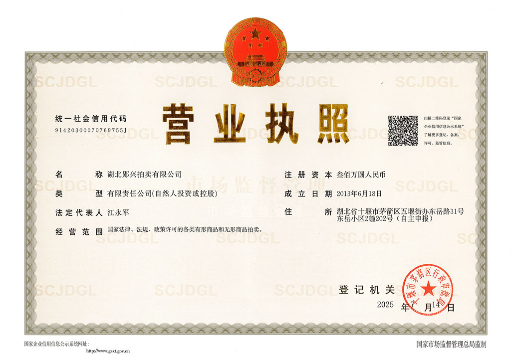 湖北鄖興拍賣有限公司是經(jīng)湖北省拍賣業(yè)主管部門批準(zhǔn),在湖北省工商行政管理部門注冊(cè),具有法人資格的綜合性一級(jí)拍賣企業(yè)。