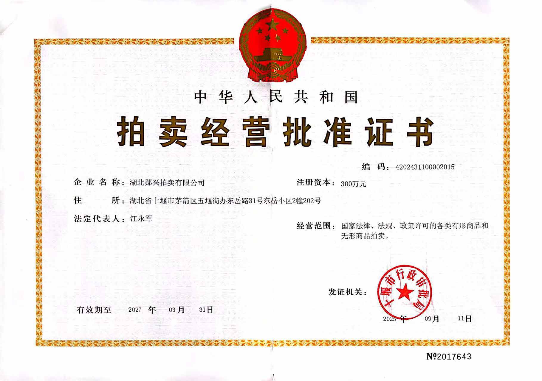 公司于2014年9月12日取得湖北省商務(wù)廳頒發(fā)的拍賣經(jīng)營批準(zhǔn)證書(證號(hào)4202431100002014),10月22日取得十堰市工商局頒發(fā)的營業(yè)執(zhí)照(證號(hào)91420300070769755J),公司注冊(cè)資本300萬元,注冊(cè)地址位于湖北省十堰市茅箭區(qū)東岳路31號(hào),法人代表江永軍。